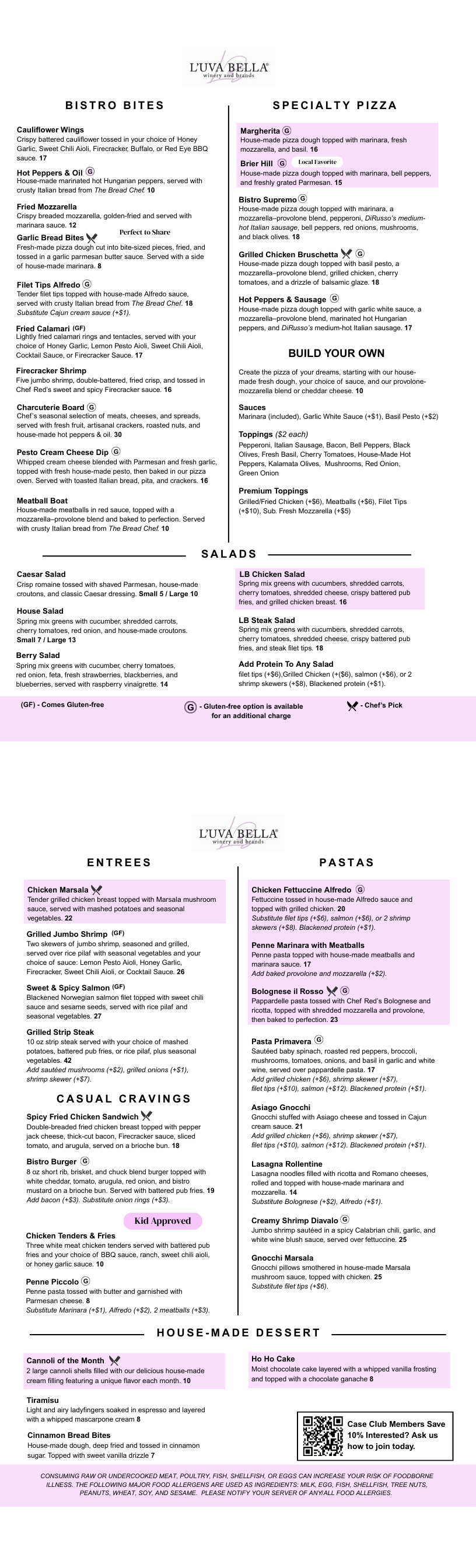 Enjoy seasonal lunch favorites at L’uva Bella Bistro—artisanal appetizers, signature pastas, fresh salads, and gourmet sandwiches—paired perfectly with our award-winning wines in a warm, welcoming atmosphere.