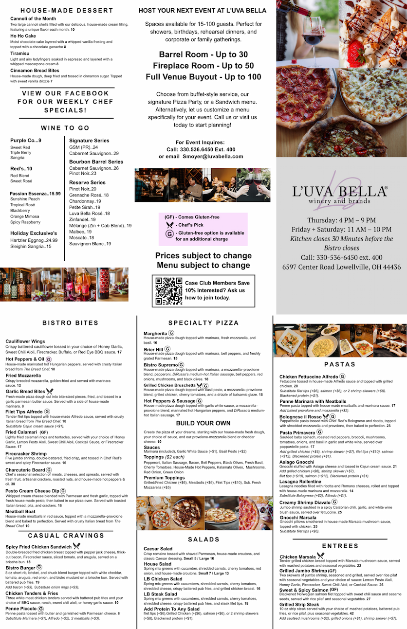 Enjoy L’uva Bella wherever the night takes you. Our to-go menu features the same modern comfort dishes you love, crafted with care and packed up for easy pickup. Perfect for cozy nights in, last-minute plans, or bringing a little Bistro flavor home — all designed to travel well and taste just as good off-site.